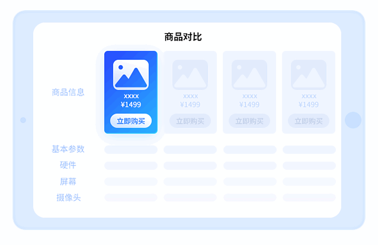 按照消费者的购买意向,可以同时对四款产品进行优选比价,从性能到外观都能进行一 一比对,针对众多手机以及电子产品,导购再也不用担心记不住产品的特长和优势,轻松了解顾客多样化选择。